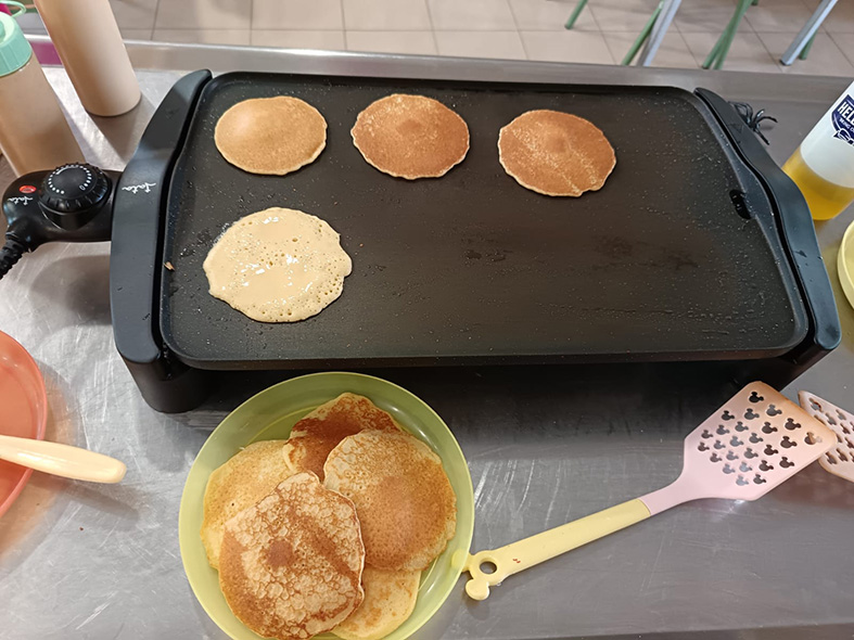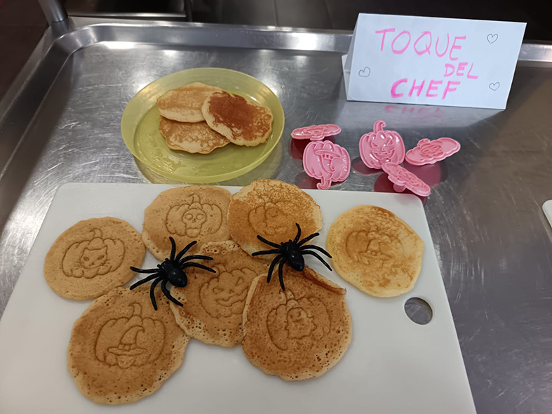 También dedicamos un momento a aprender sobre la importancia de la organización en cocina con una actividad de mise en place para preparar panquecas, en la que cada niño y niña pudo ver cómo un buen orden facilita el trabajo y mejora el resultado final.