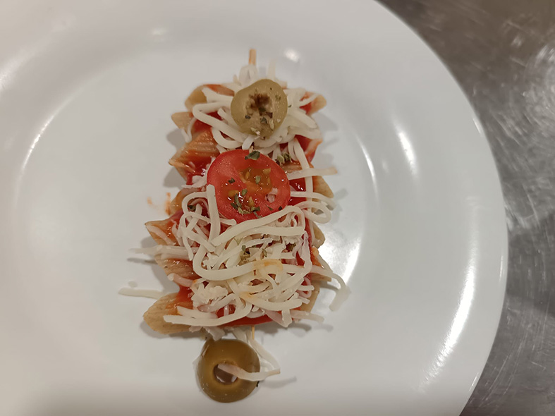Para terminar, preparamos un pincho de macarrones integrales con salsa de tomate. Aprovechamos esta receta para explicarles los beneficios de consumir pasta integral, que ayuda al bienestar de la tripa gracias a su mayor aporte de fibra.