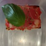 Tomate en brunoise con jamón serrano, acompañado de un toque del chef con hoja de albahaca y orégano, repasando técnicas de corte.