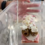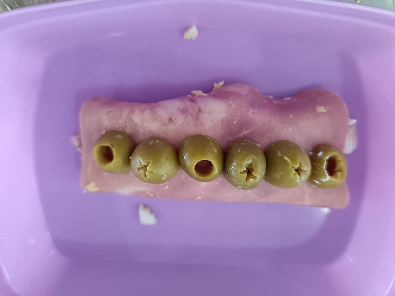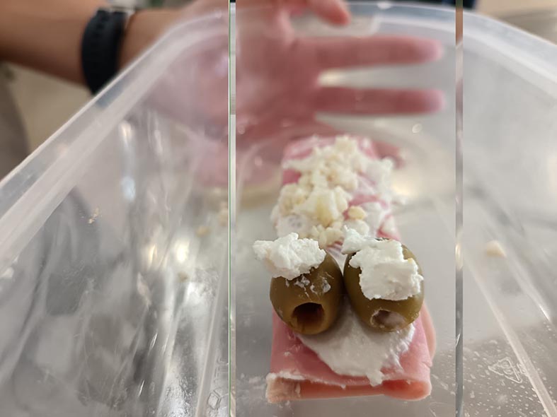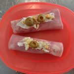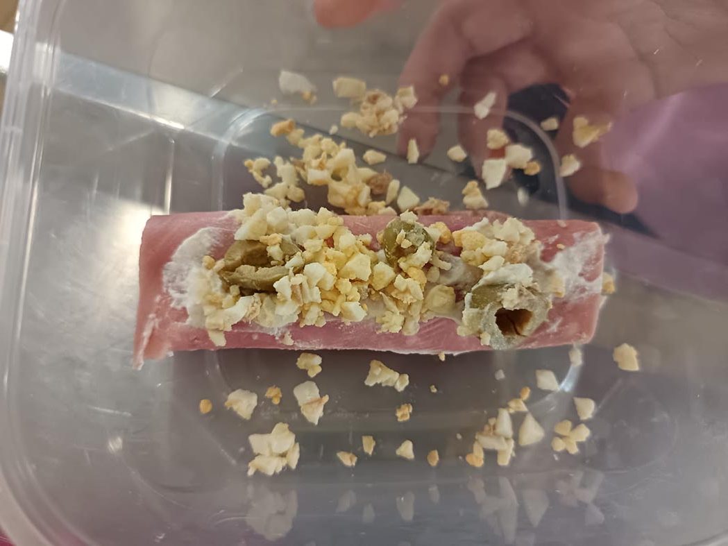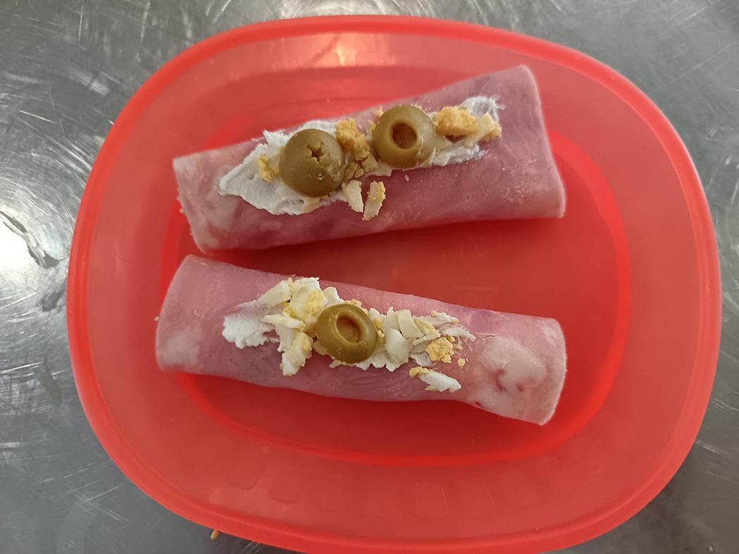Rollitos de jamón, rellenos de queso crema, atún y huevo cocido, decorados al gusto de cada chef, fomentando la creatividad y la presentación.