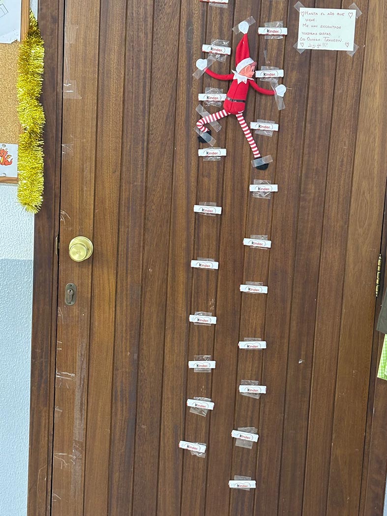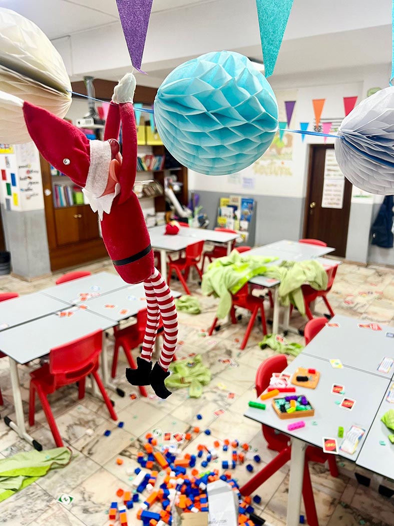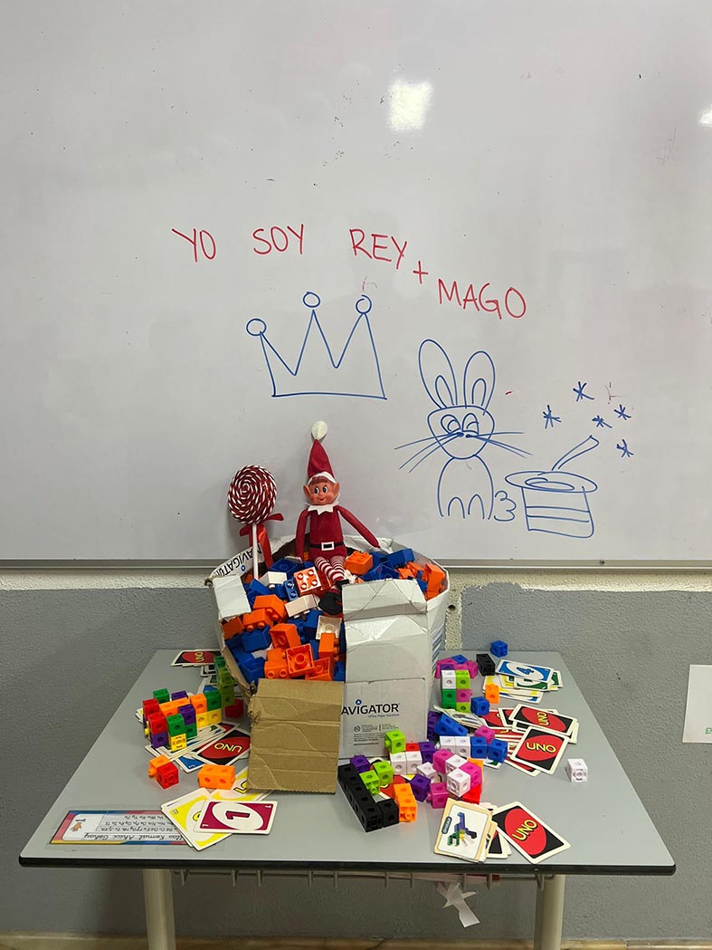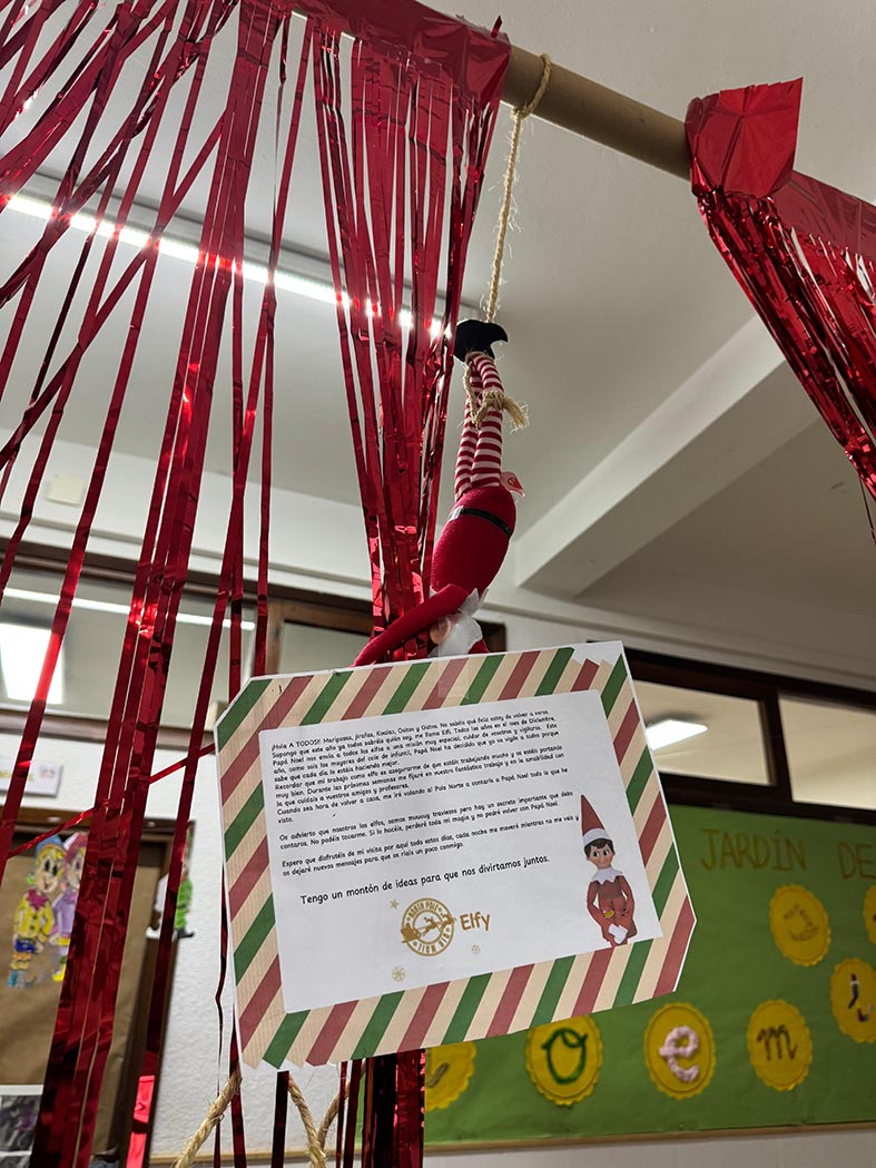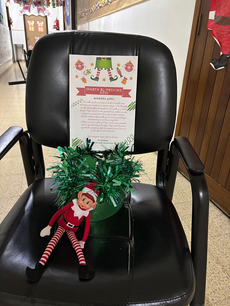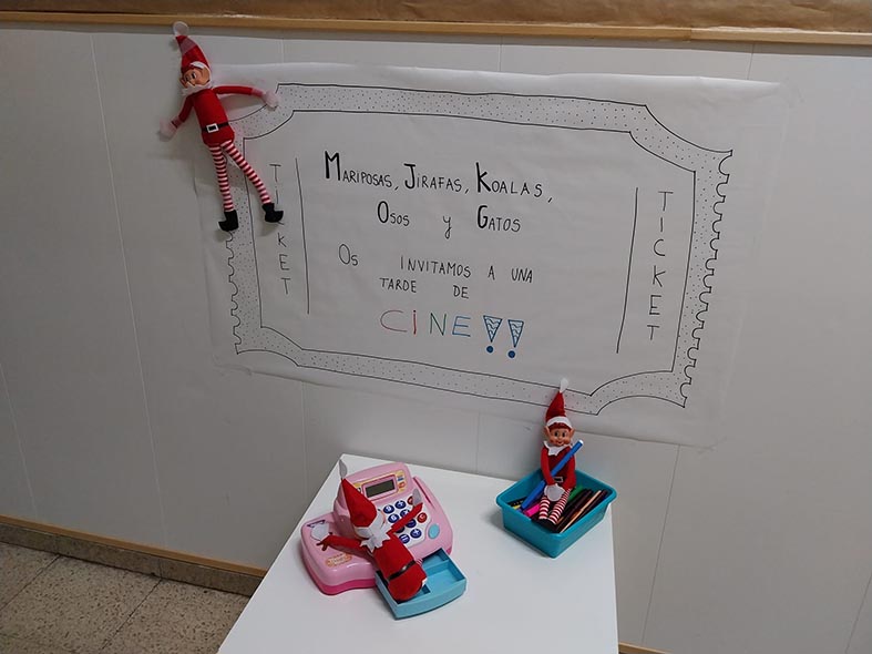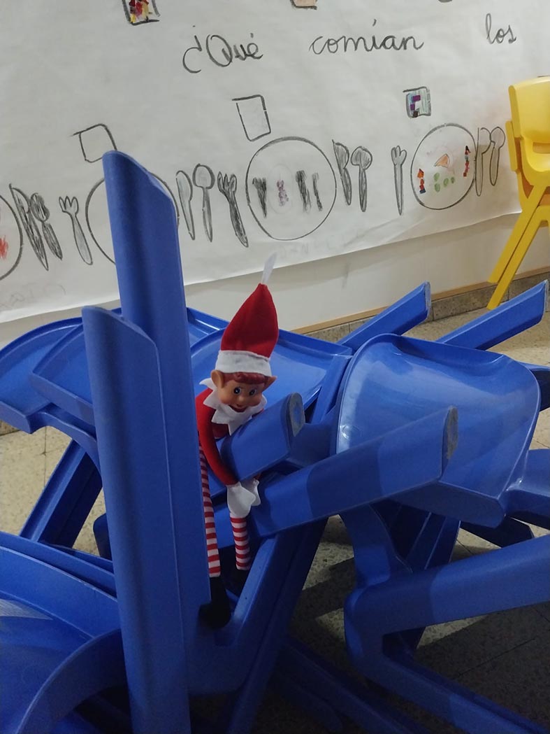 A lo largo de estos días nos encontramos con mesas del aula completamente del revés, como si alguien hubiera estado ensayando acrobacias nocturnas, fiestas improvisadas al caer la noche, mascotas secuestradas, elfos paseando en patines por los pasillos, e incluso invitaciones sorpresa para ir al cine…